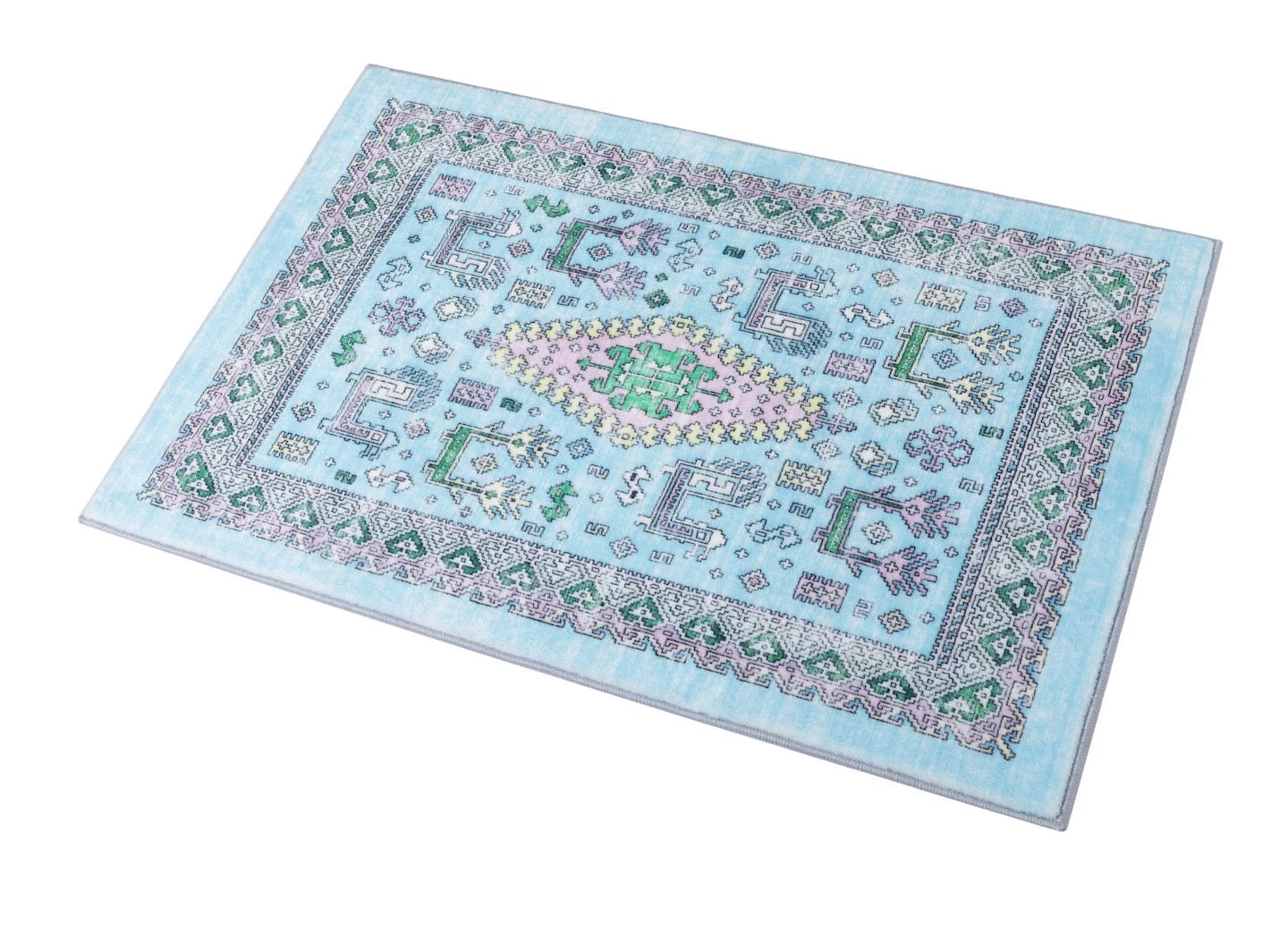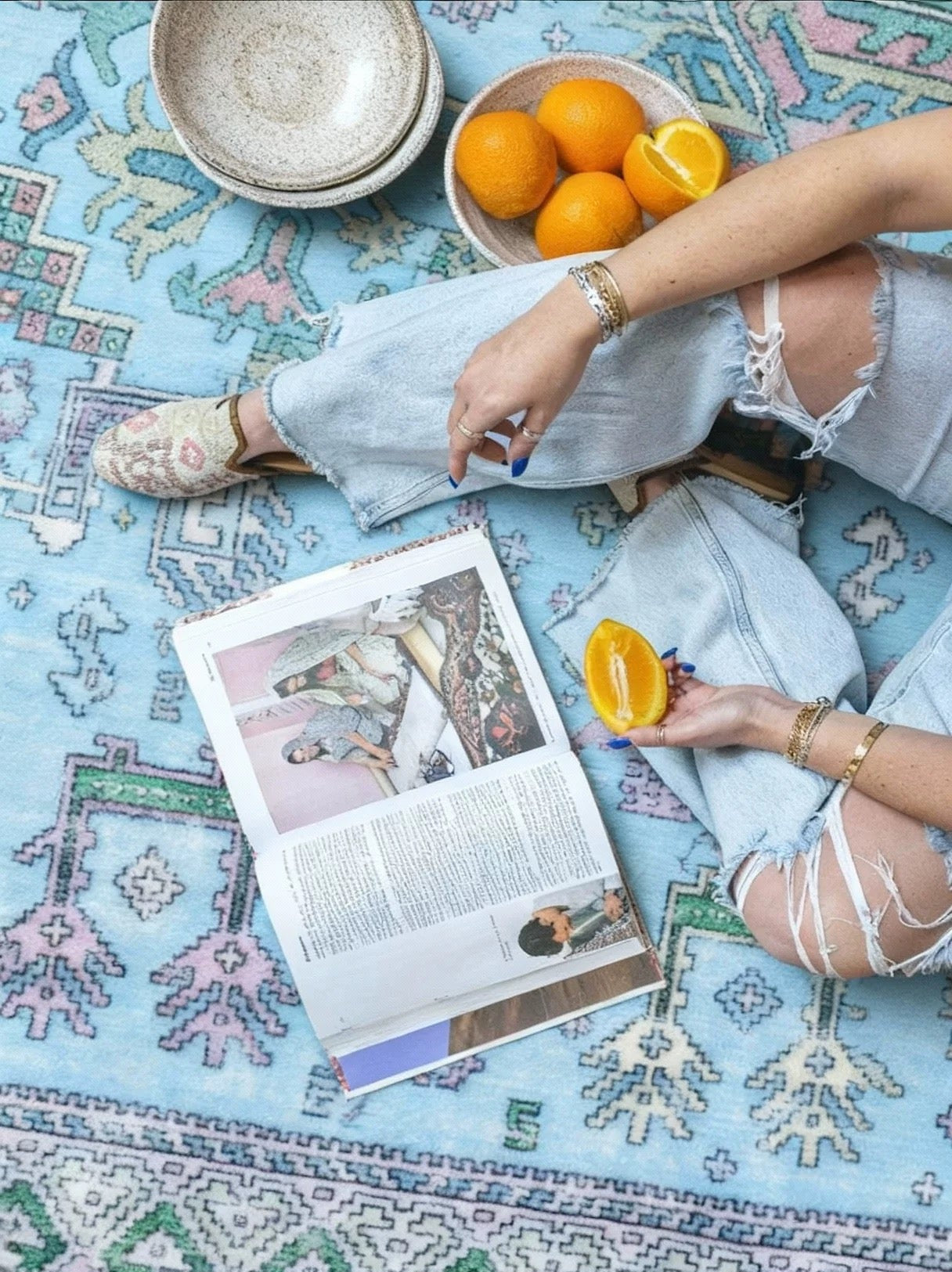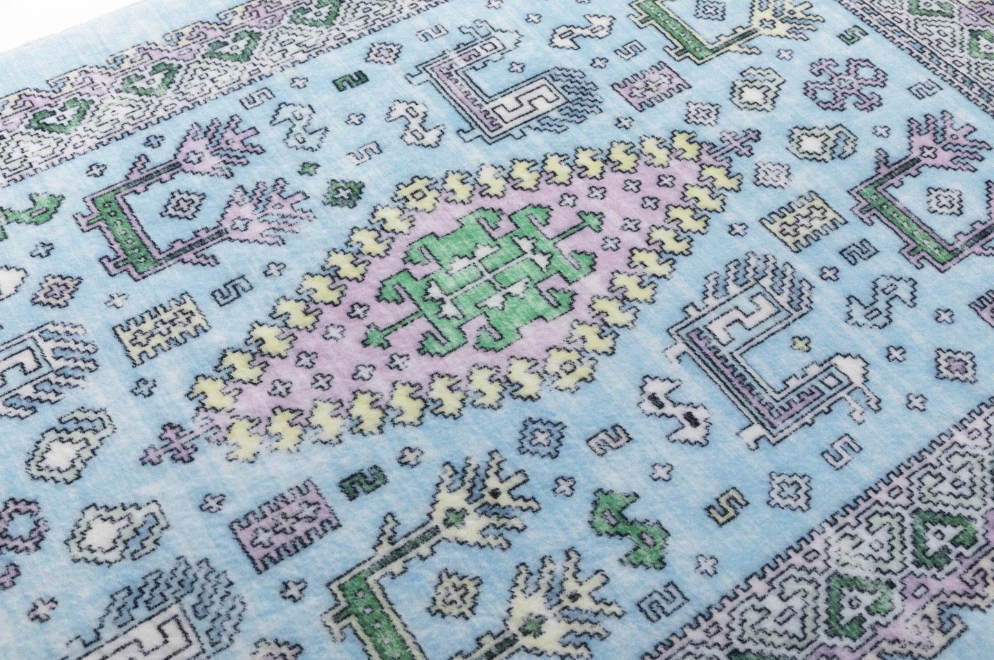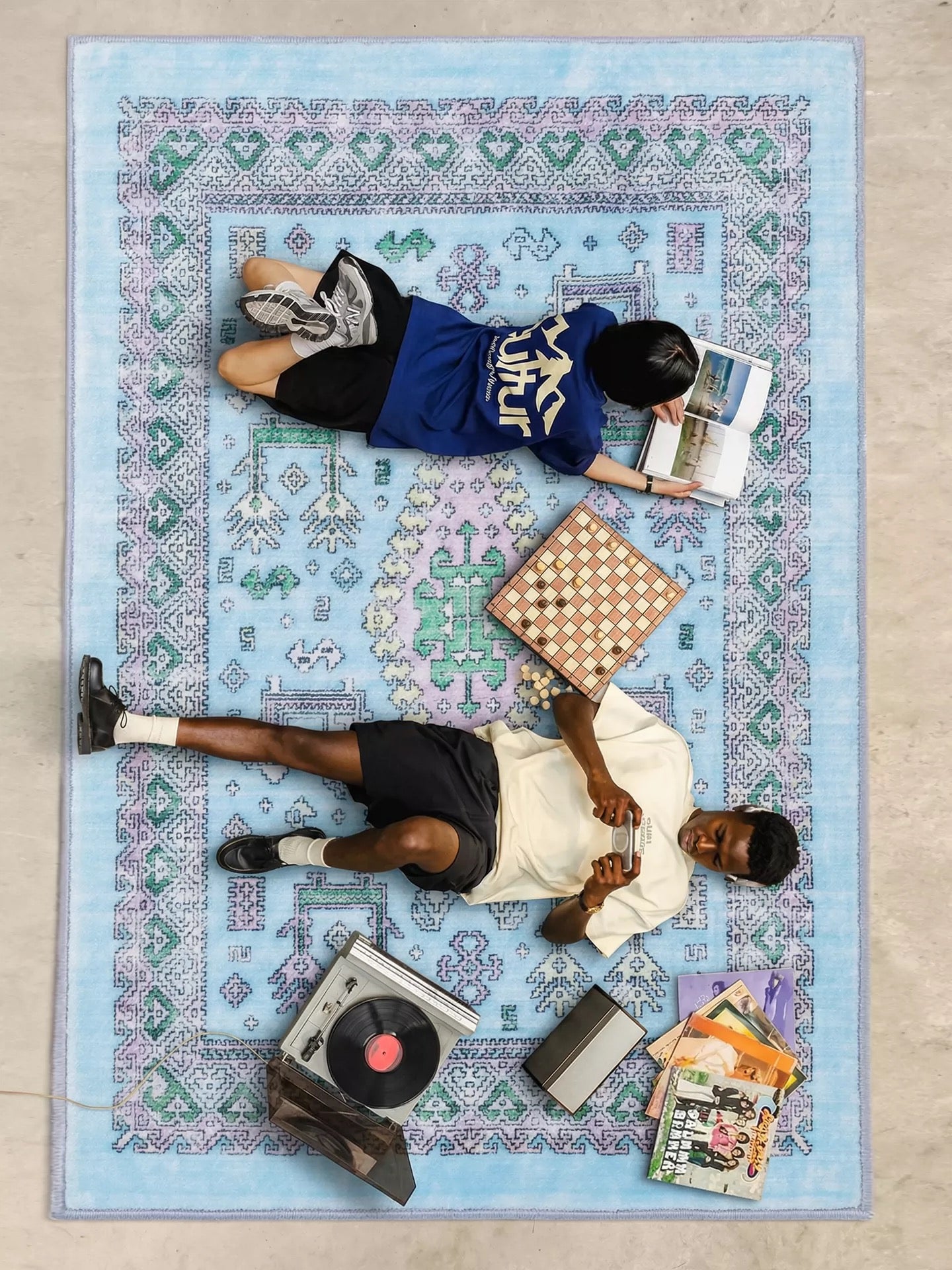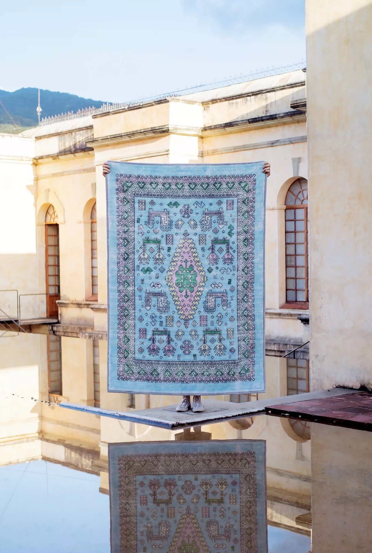 マカロンカラーがペルシャ絨毯の重厚さを優しく中和。