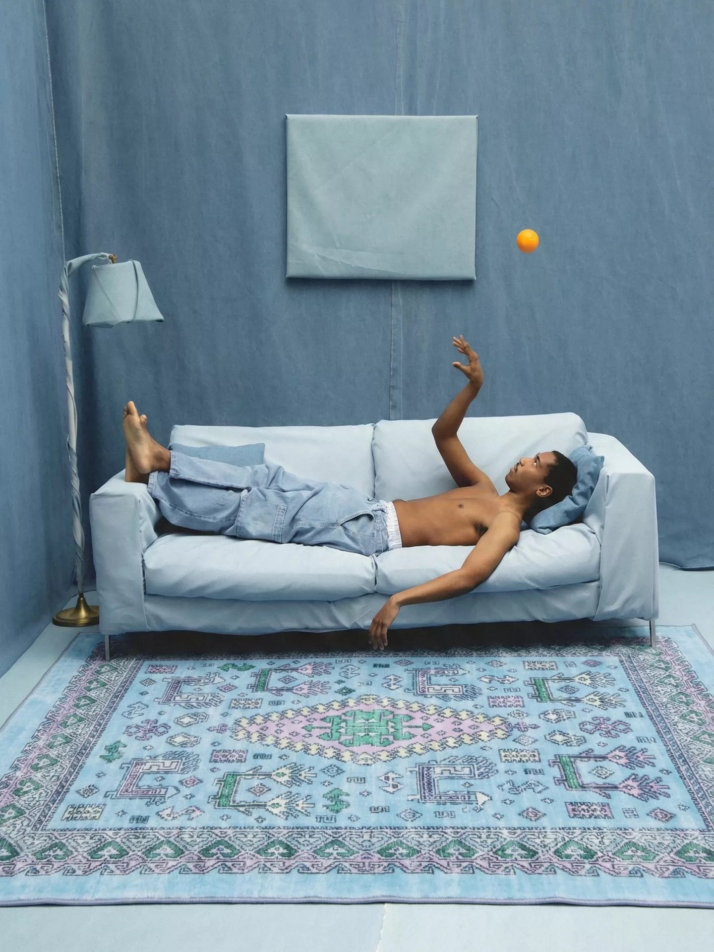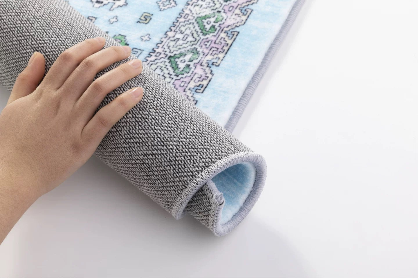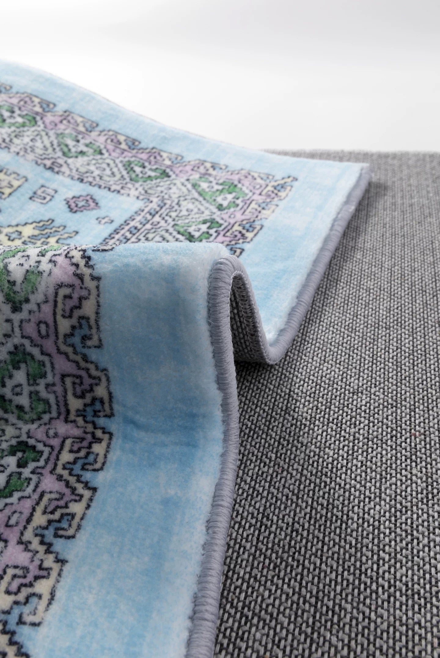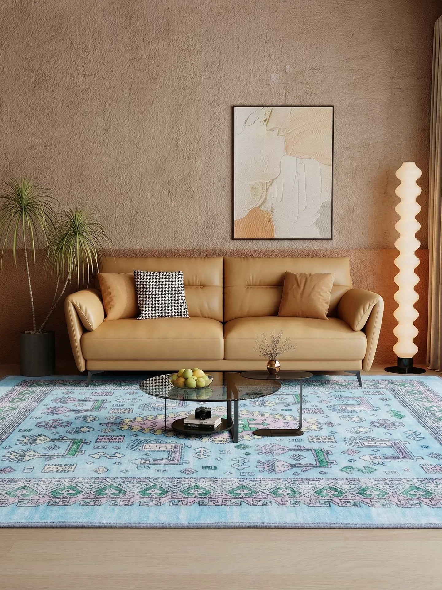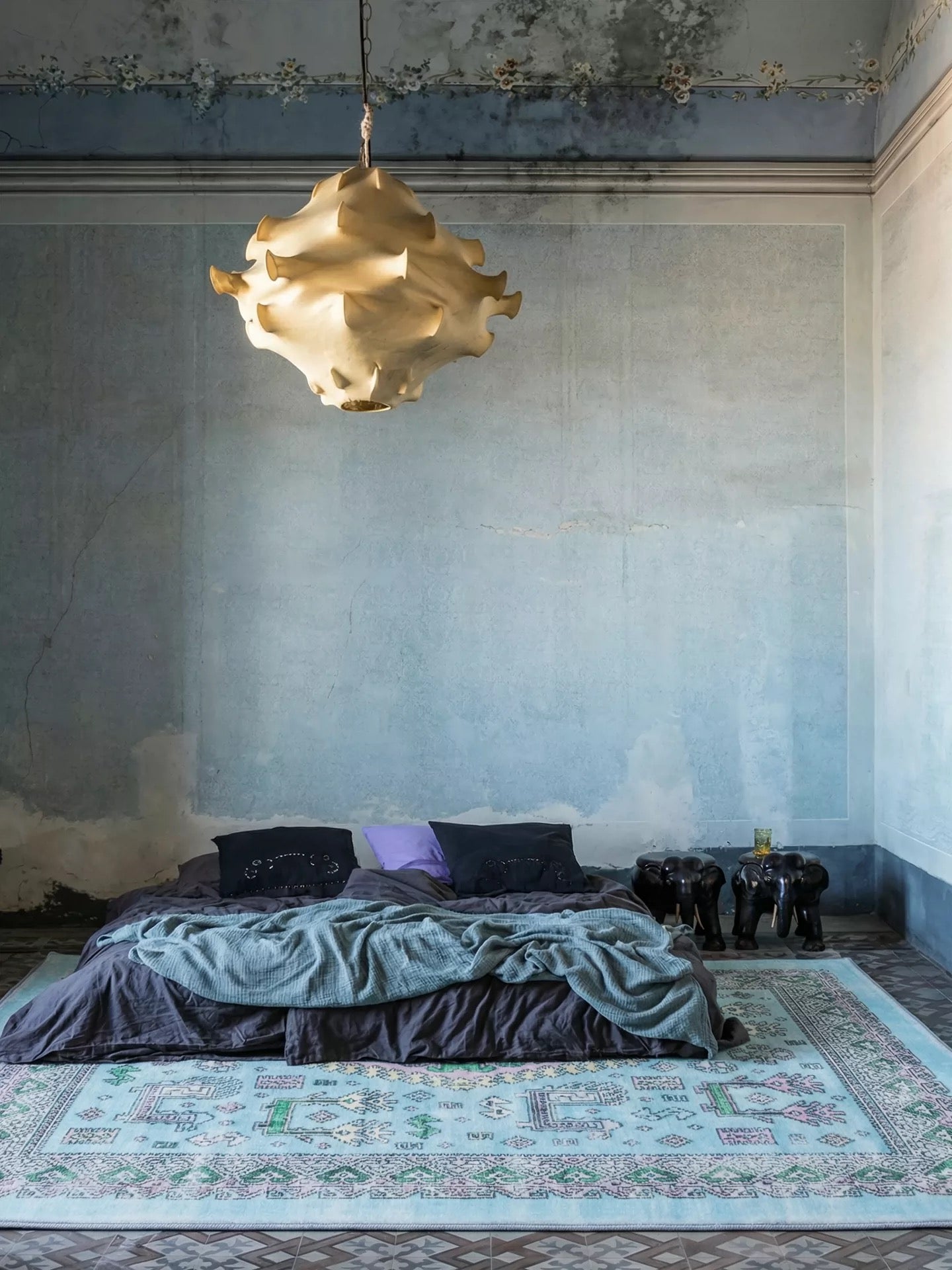 マカロンカラーがペルシャ絨毯の重厚さを優しく中和。